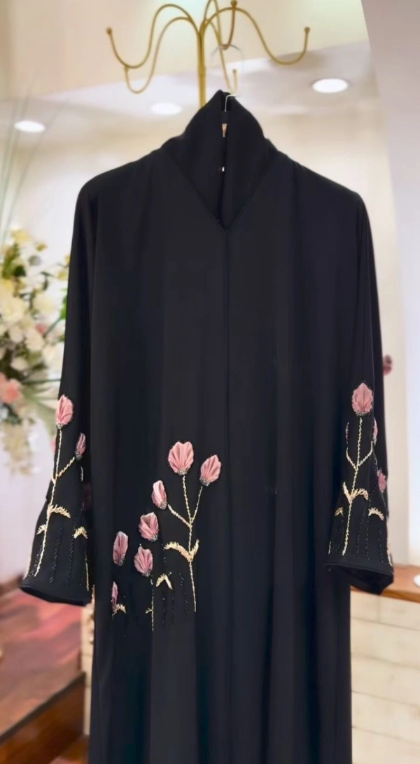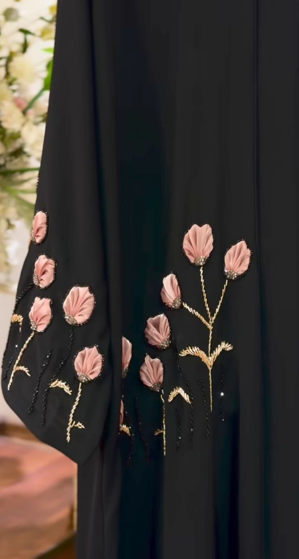 Abaya is made up of imported Nida Fabric it comes along with dupatta as it's front open abaya with buttons. It does have handwork and tissue flowers organza flowes