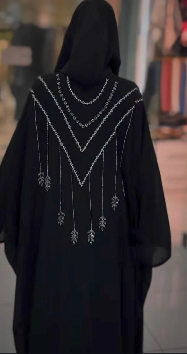 Abaya is made up of imported Nida fabric it does have handwork at back and and also pearls studded over it. It's front open abaya and comes along with dupatta