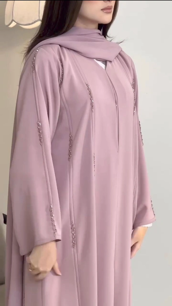 Abaya is made up of Korean Peada Fabric and it does have handwork studded over sleeves and it does have umbrella cut sleeves and comes along with dupatta