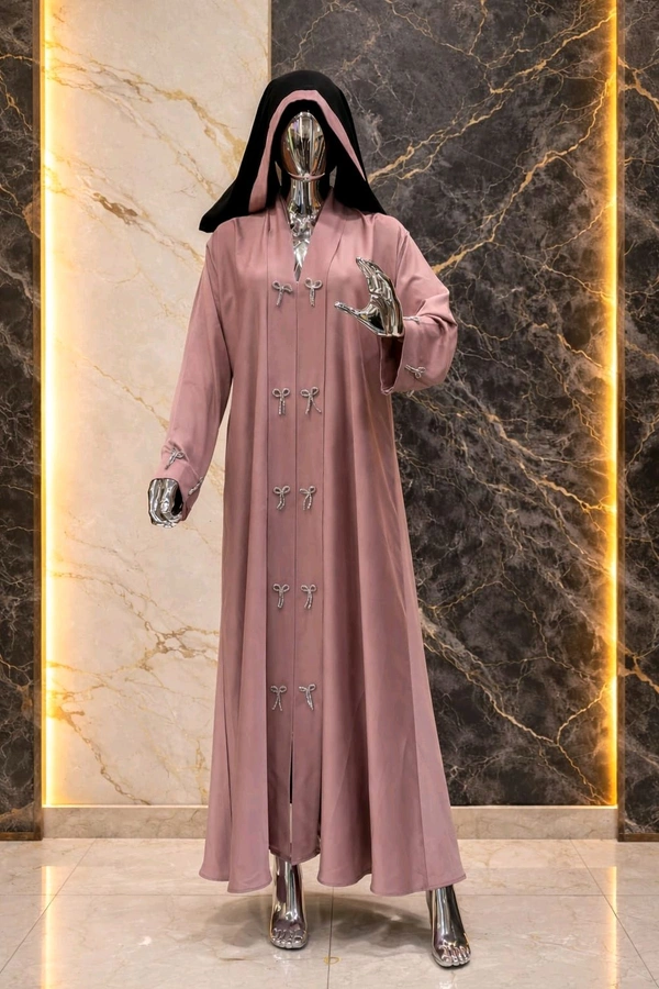 Abaya is made up of imported tiktok Fabric it does have bow designs at front which are handtucked it comes along with dupatta