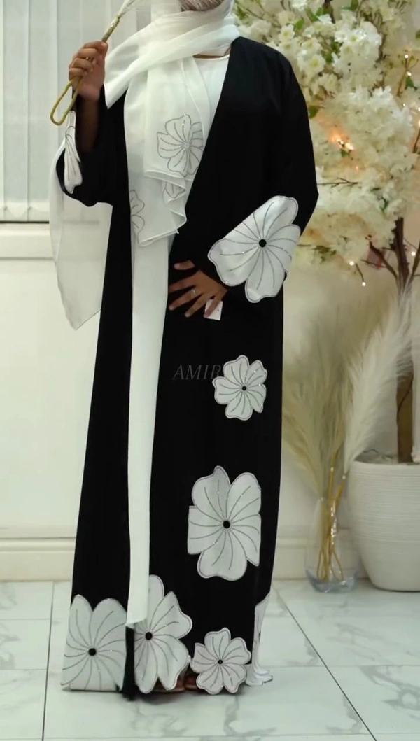 Abaya is made up of Korean Prada fabric it's 2 pc shrug abaya comes along with separate inner and outer with 3d flower patches and comes along with dupatta